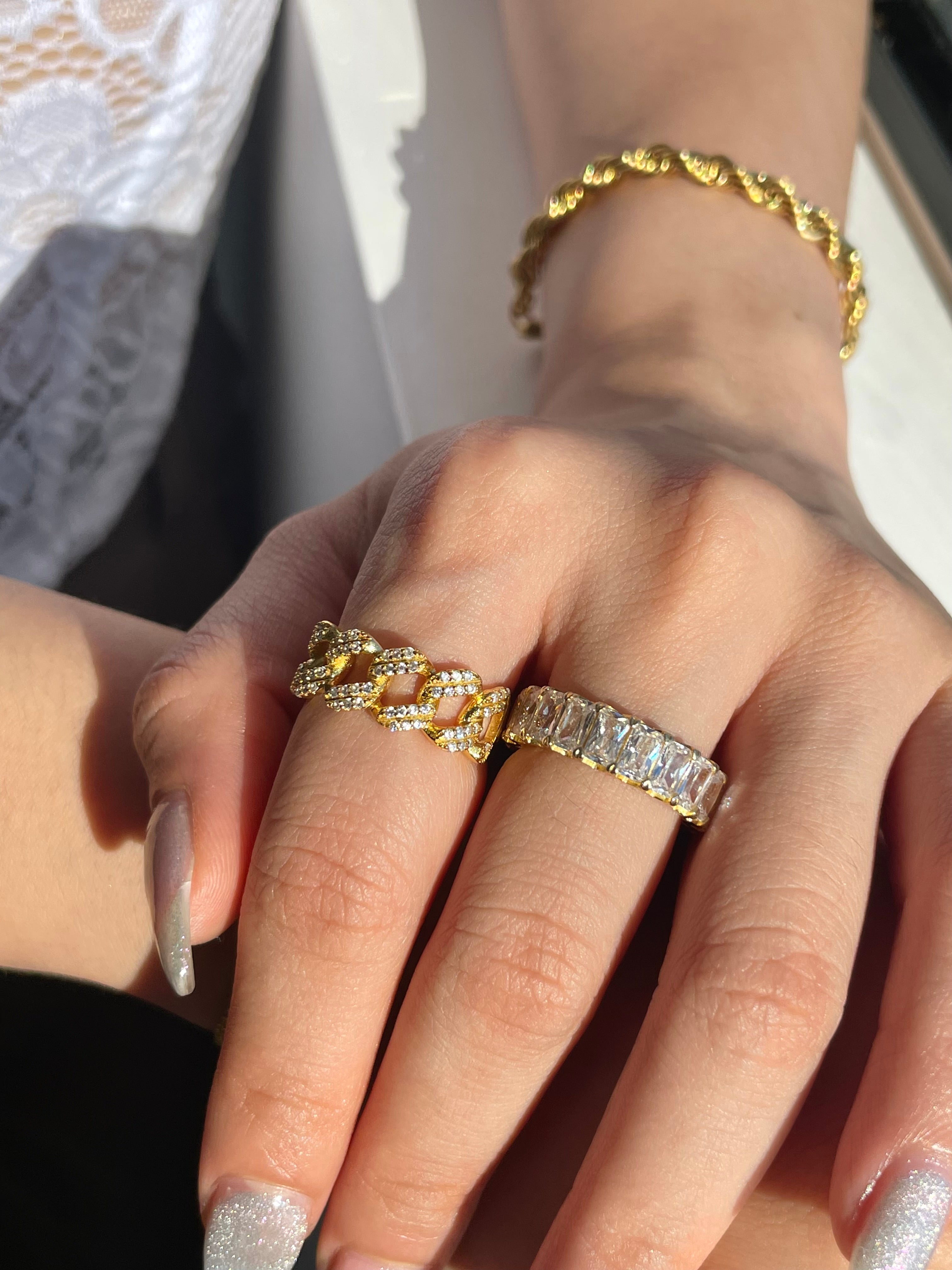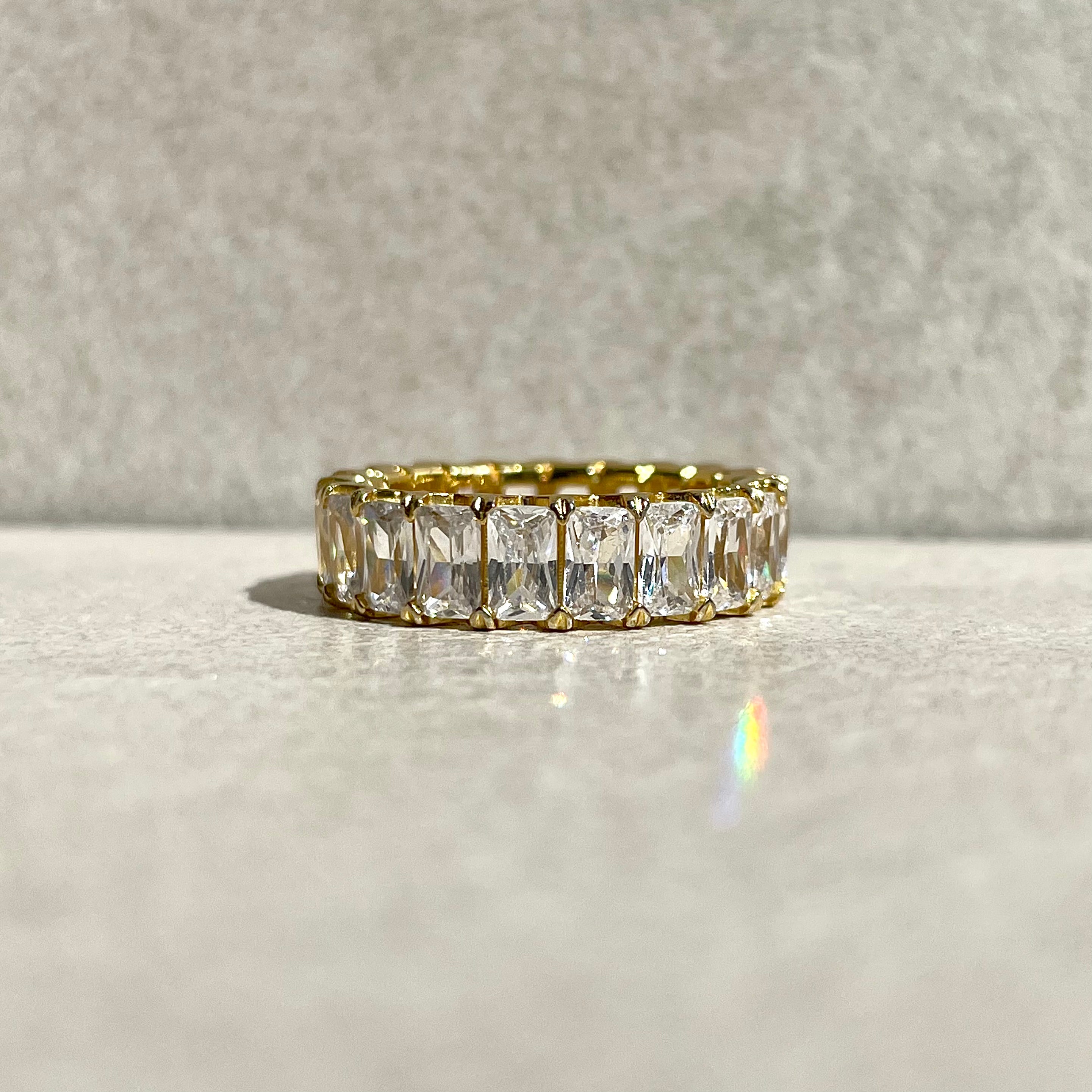 Introducing our Esmeralda Ring—a symbol of eternal elegance. This exquisite ring features a continuous band adorned with meticulously arranged baguette-cut gemstones, exuding a timeless allure that captivates with its sleek lines and understated sophistication. For a glamorous night out, add our Esmeralda hoops as the perfect set!