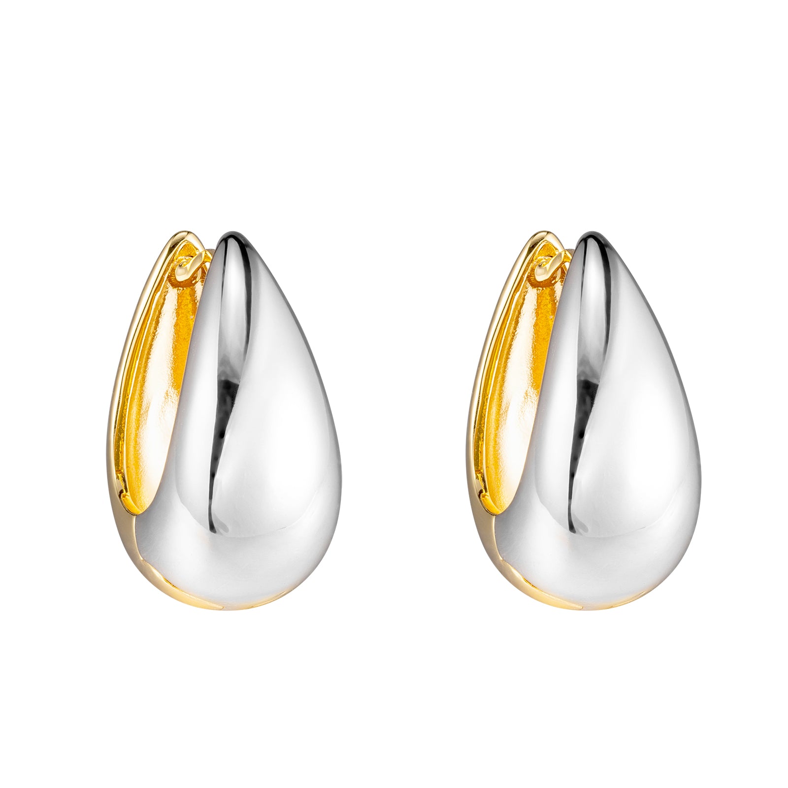 Alexandra Earrings — a bold yet elegant take on modern style. Designed with a smooth teardrop silhouette, these two-tone earrings blend gold and silver, making them easy to style for any occasion.